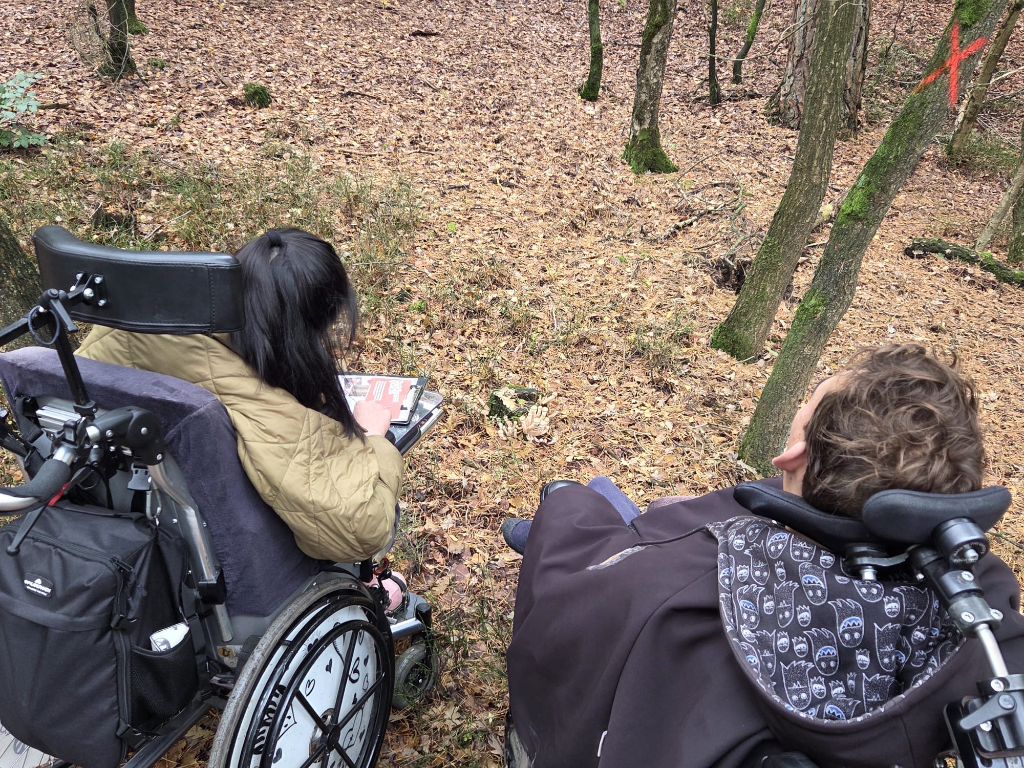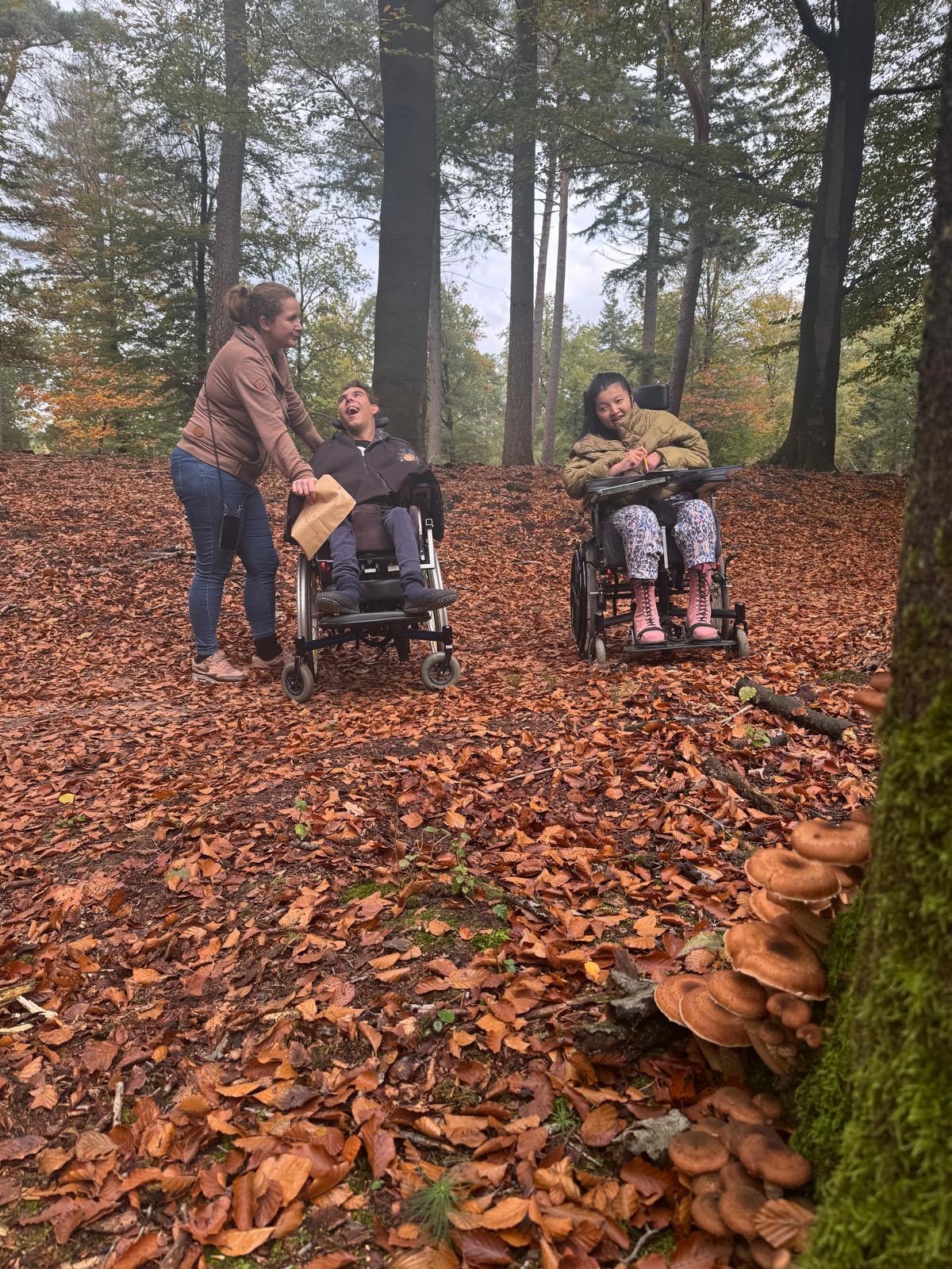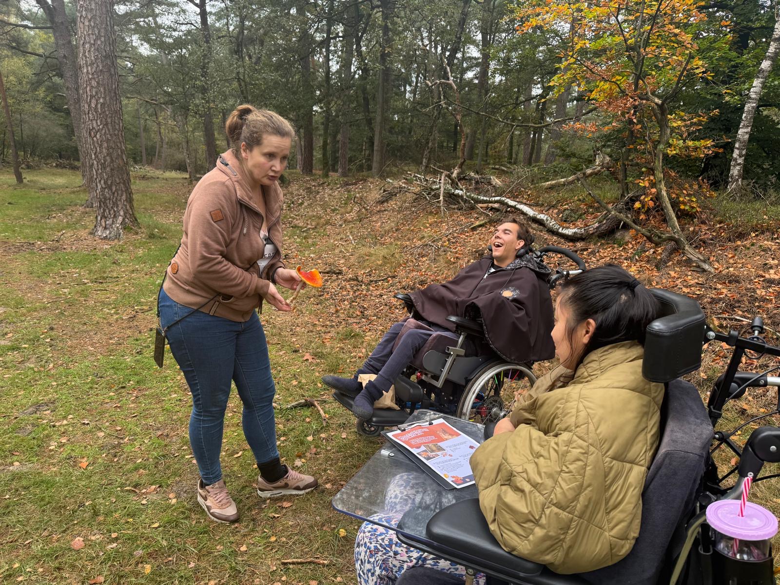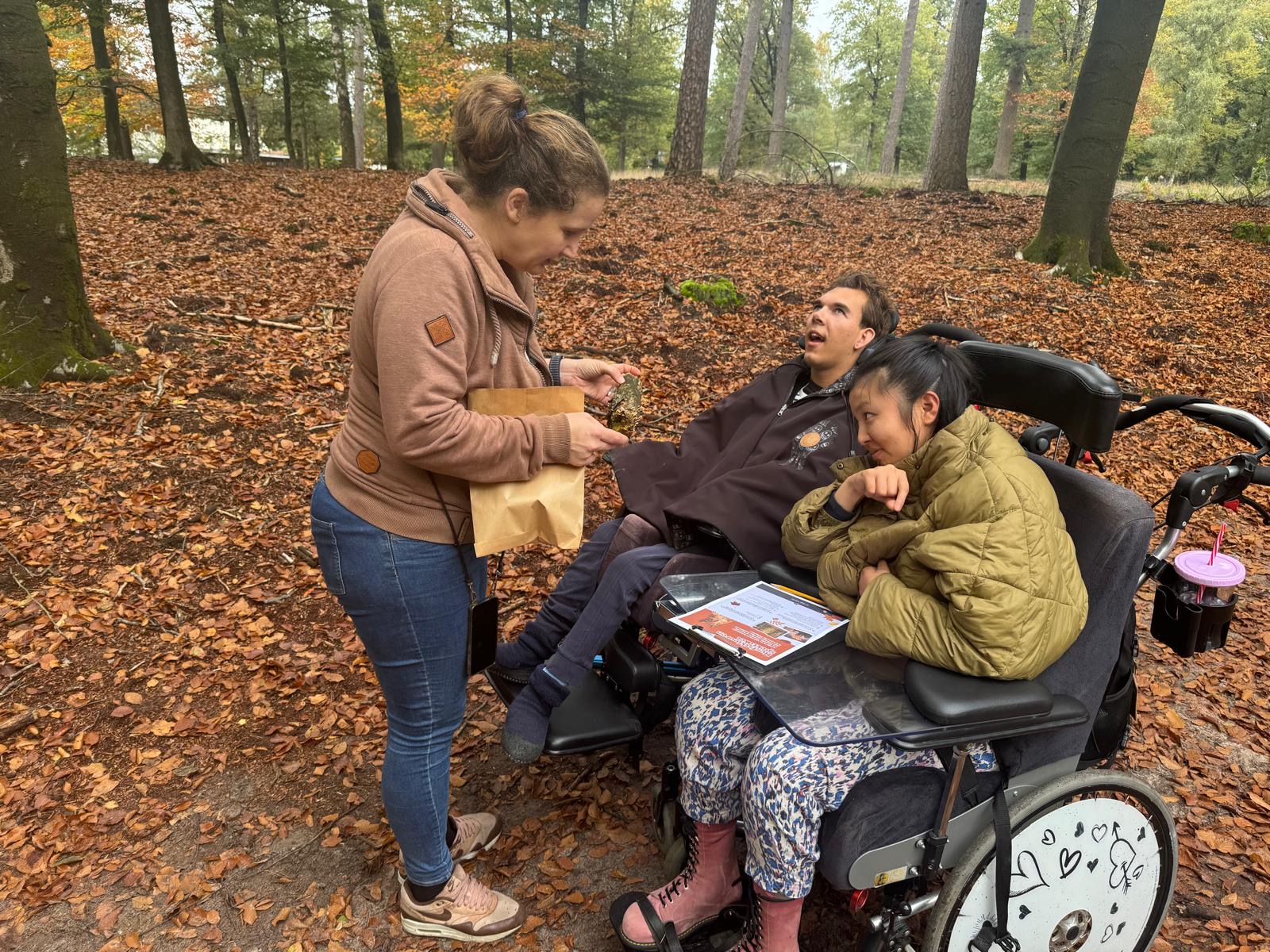 Daarna zijn we een herfstroute gaan lopen. We moesten een aantal vragen beantwoorden en kregen een zak mee om spullen te verzamelen. Het pad was niet geheel rolstoelproof maar daar laten wij ons niet door ontmoedigen. We hebben enorm veel paddenstoelen gezien en blaadjes verzameld. Met de antwoorden op de vragen mochten we naar de boswachter. Hij heeft toen nog uitleg gegeven over waarom blaadjes andere kleuren krijgen in de herfst en waarom ze uitvallen. Mees was heel aandachtig naar hem aan het luisteren.