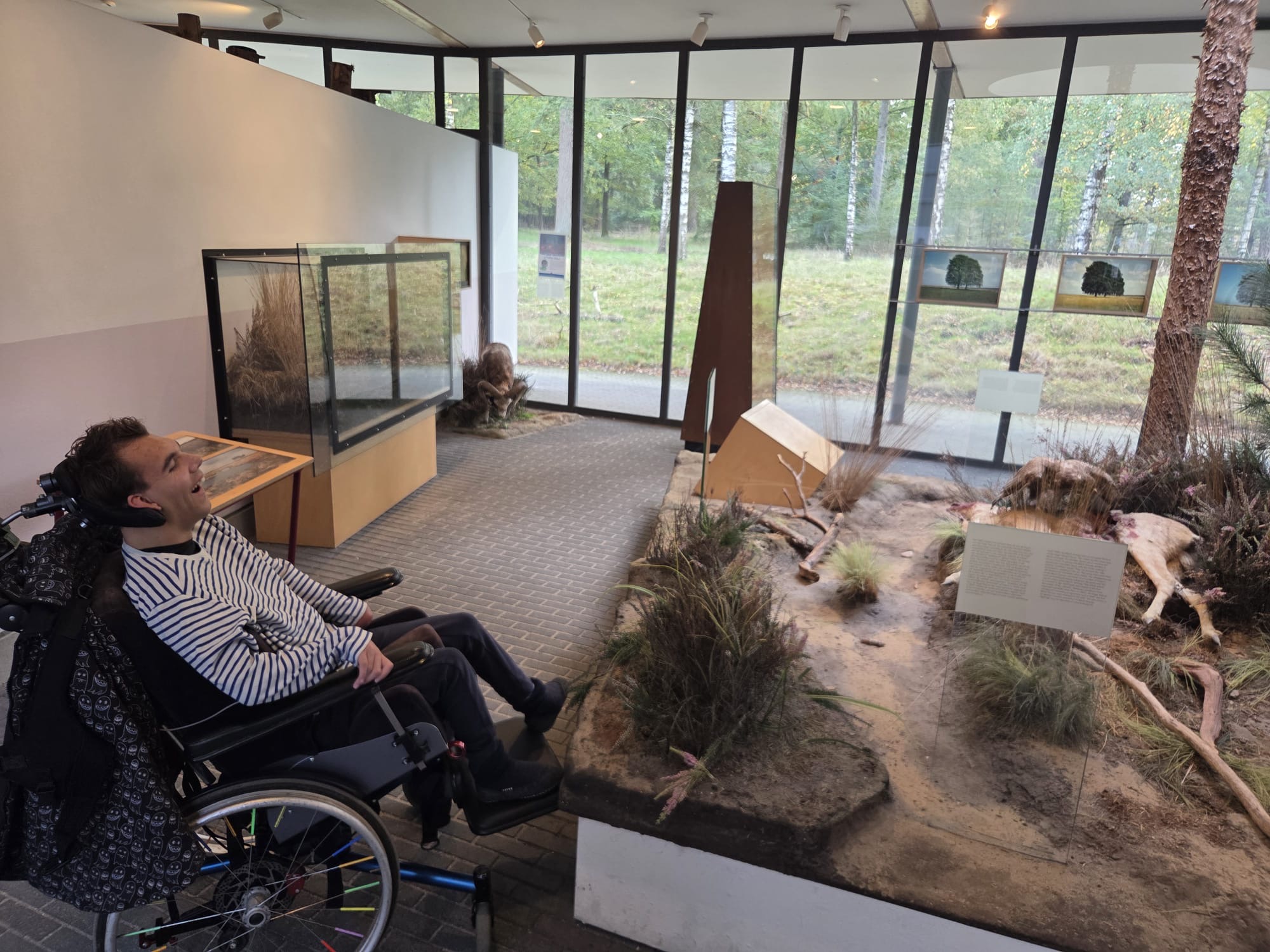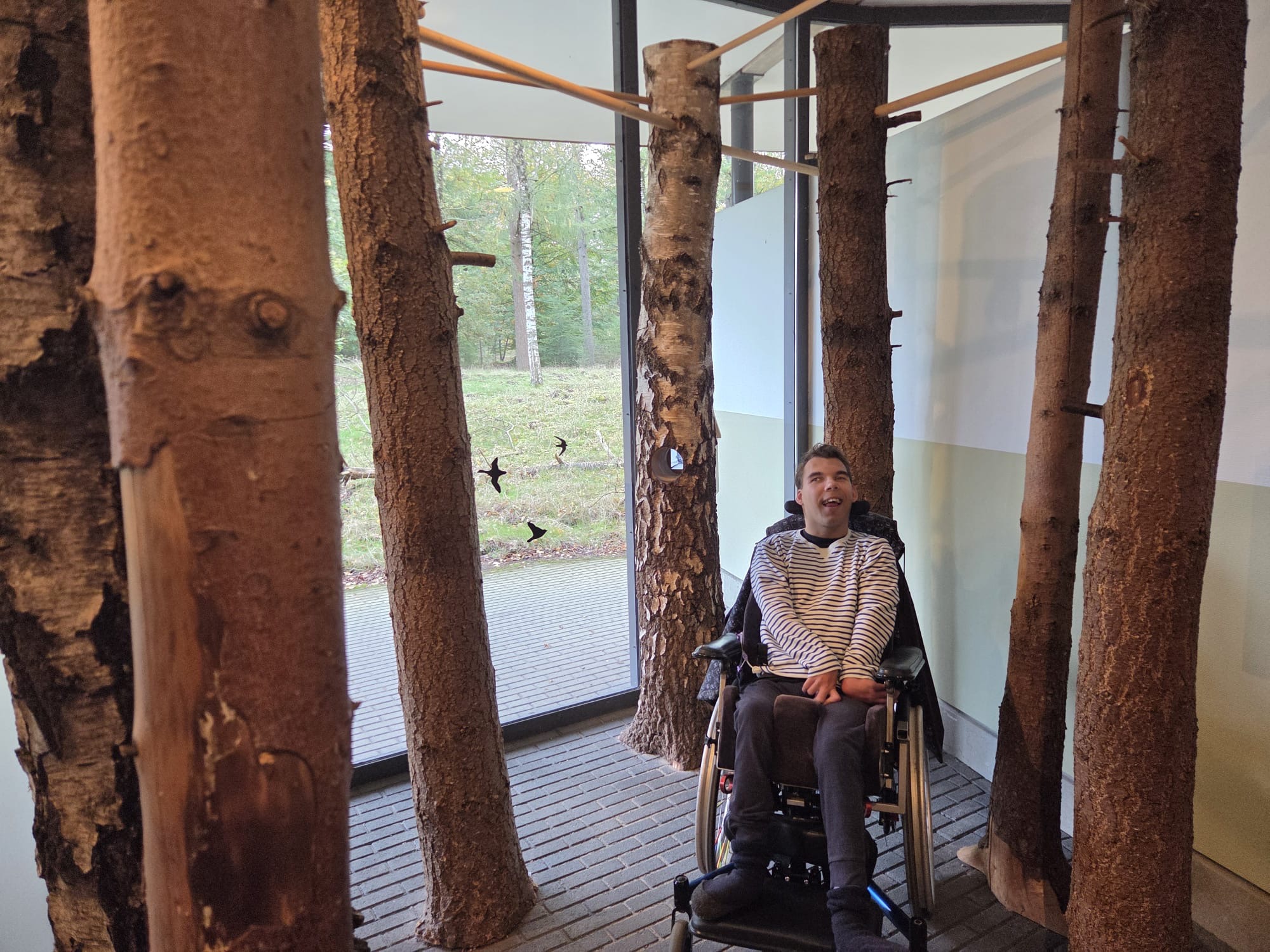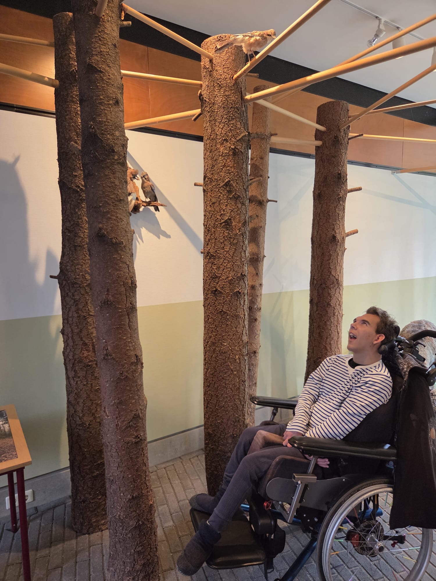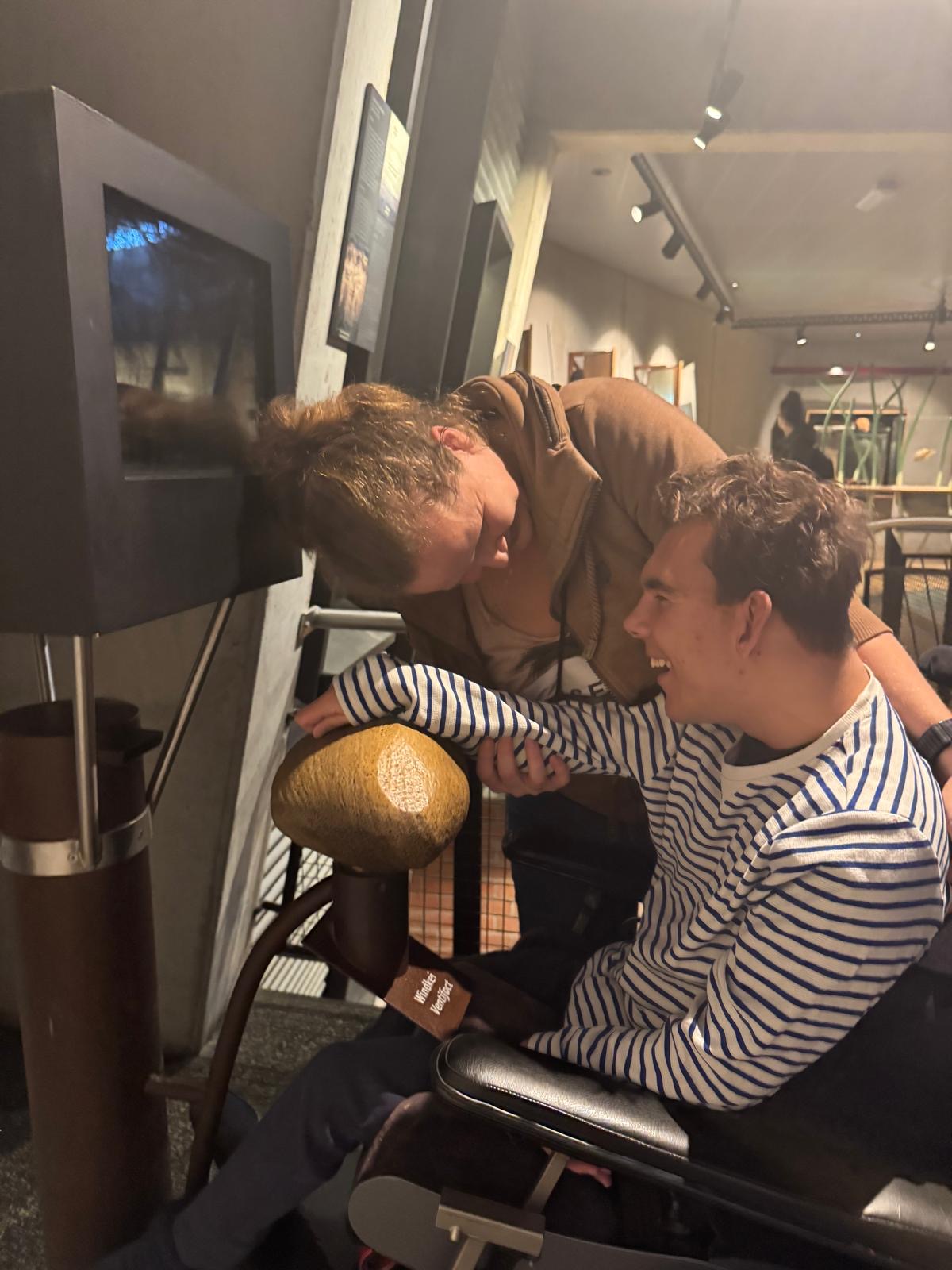 Daarna konden we in een bos met vogelgeluiden rondlopen, dat was natuurlijk fantastisch. Hierna vertrokken we naar beneden. Daar konden we in het binnenste van de aarde kijken. Mees kon het vanuit zijn rolstoel niet zien dus heb ik hem bovenop het kijk glas gelegd. Daar moest hij enorm om lachen en hij zat aandachtig naar beneden te kijken. Op het plafond konden we de deltawerken zien. Ook konden we verschillende zwerfkeien zien en voelen waarbij je de wind kon voelen waarmee ze glad gemaakt worden. Erg leerzaam allemaal.