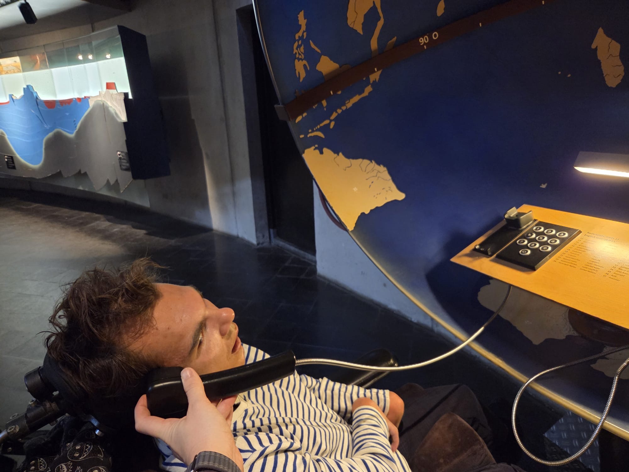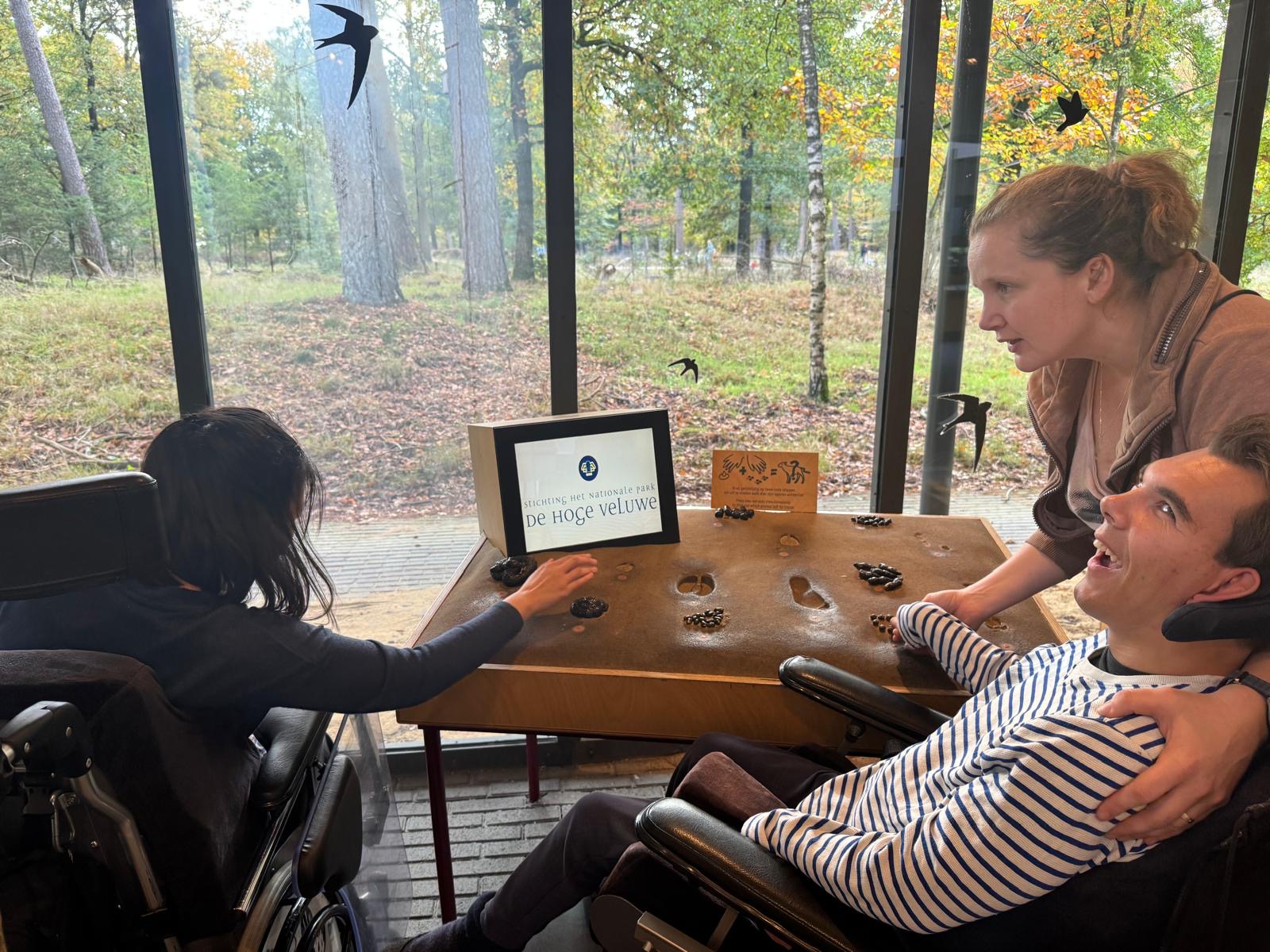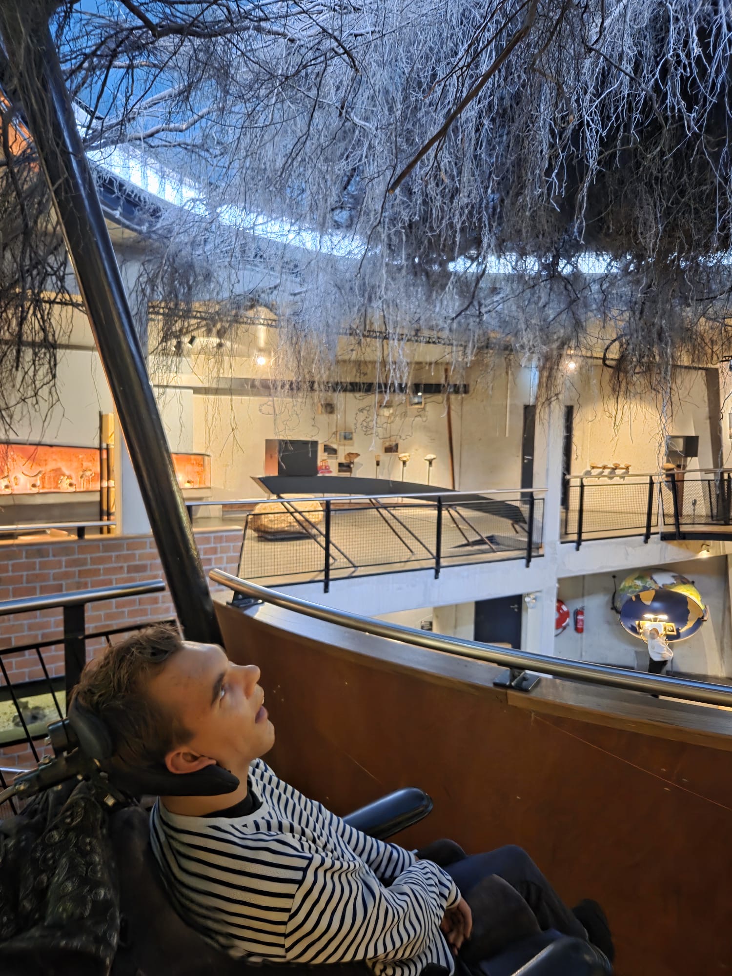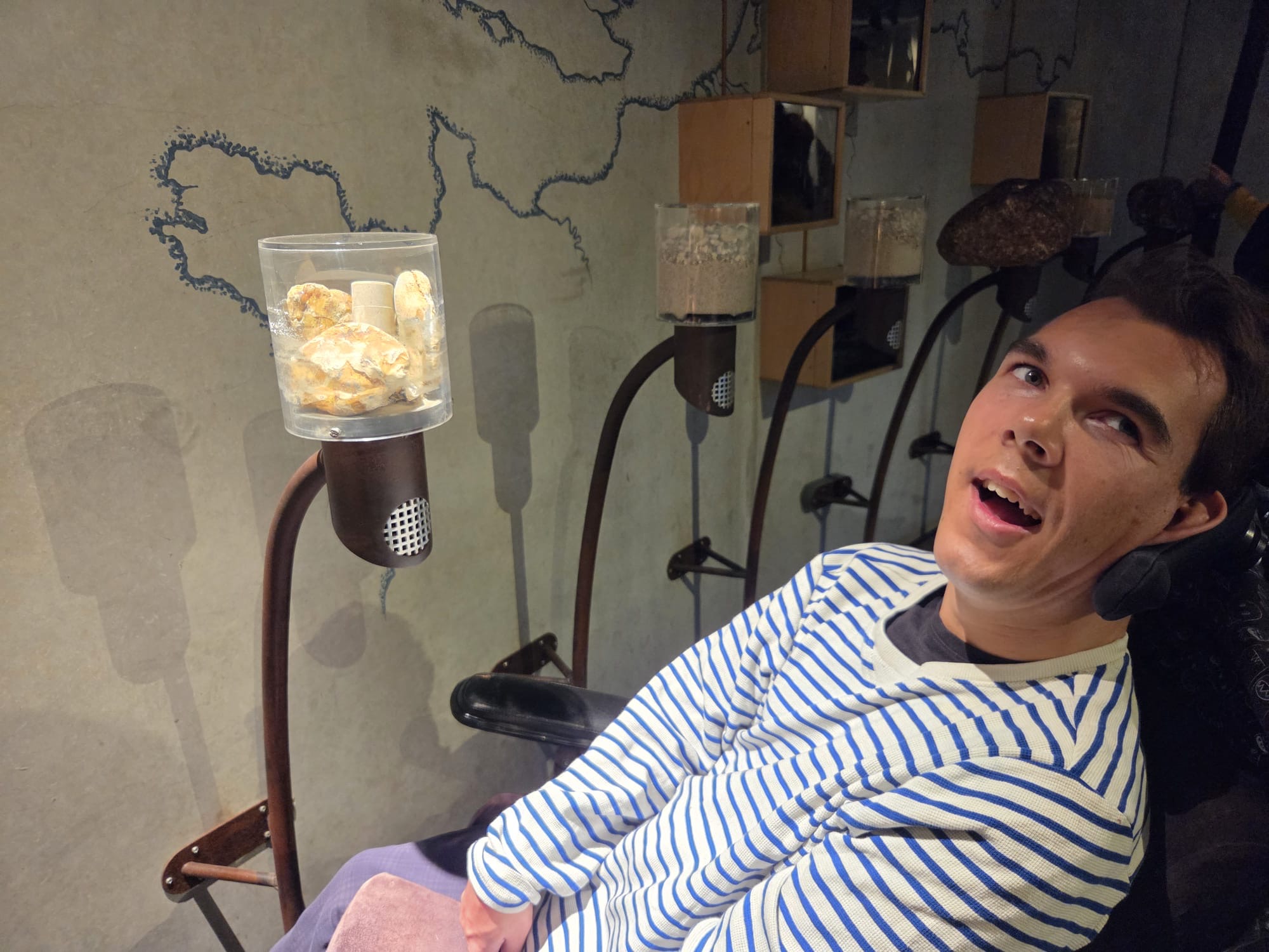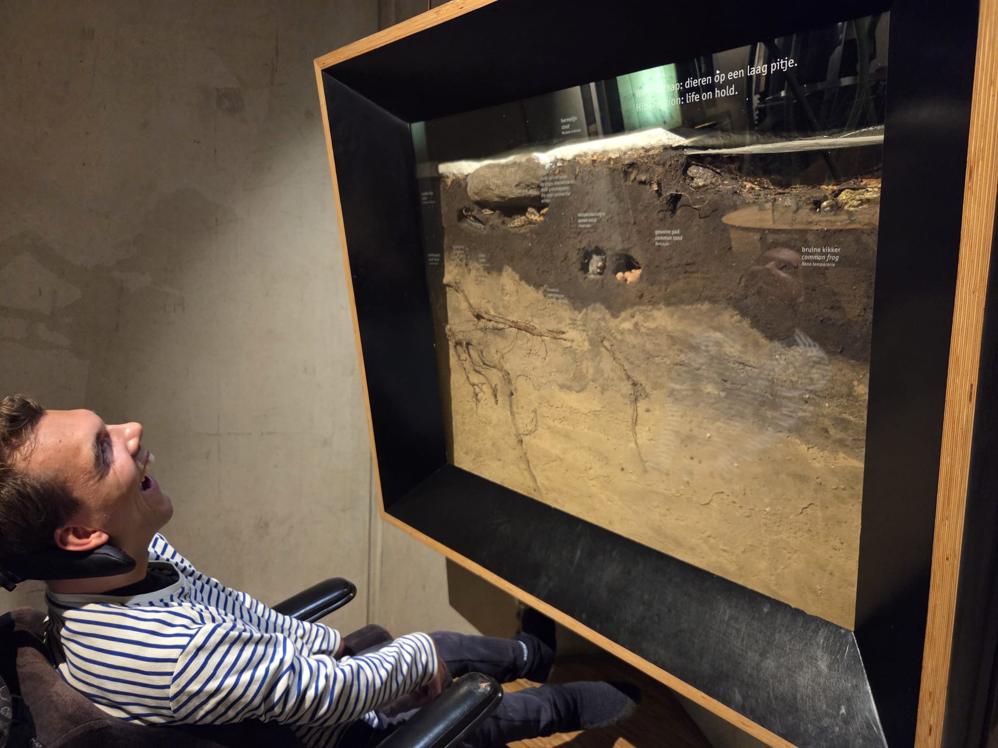 Daarna konden we in een bos met vogelgeluiden rondlopen, dat was natuurlijk fantastisch. Hierna vertrokken we naar beneden. Daar konden we in het binnenste van de aarde kijken. Mees kon het vanuit zijn rolstoel niet zien dus heb ik hem bovenop het kijk glas gelegd. Daar moest hij enorm om lachen en hij zat aandachtig naar beneden te kijken. Op het plafond konden we de deltawerken zien. Ook konden we verschillende zwerfkeien zien en voelen waarbij je de wind kon voelen waarmee ze glad gemaakt worden. Erg leerzaam allemaal.