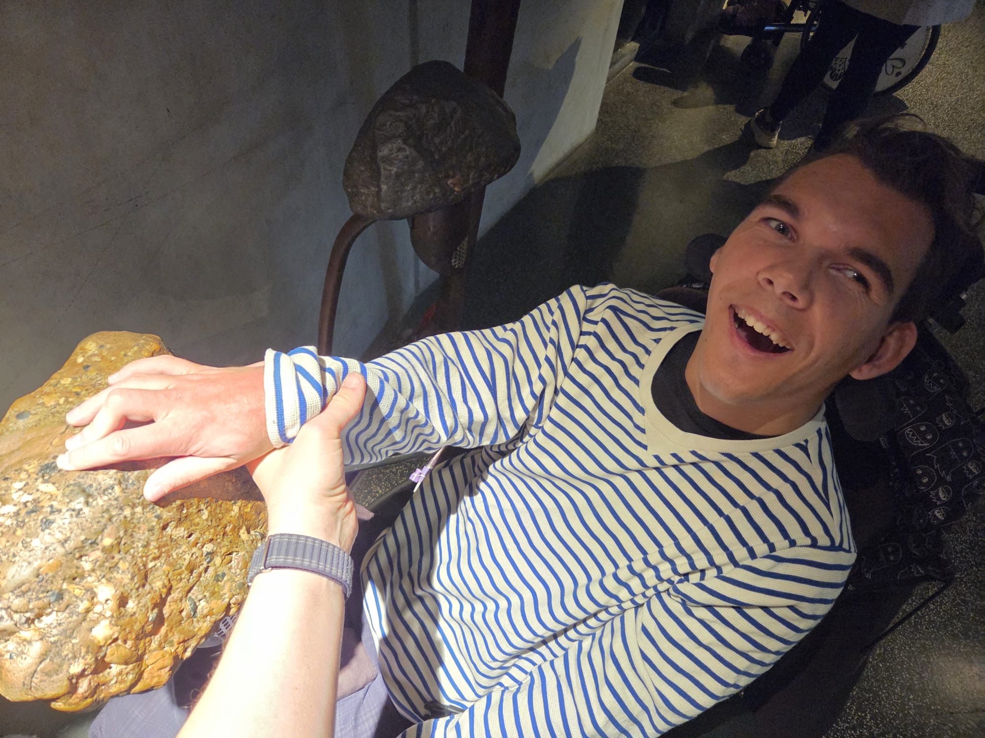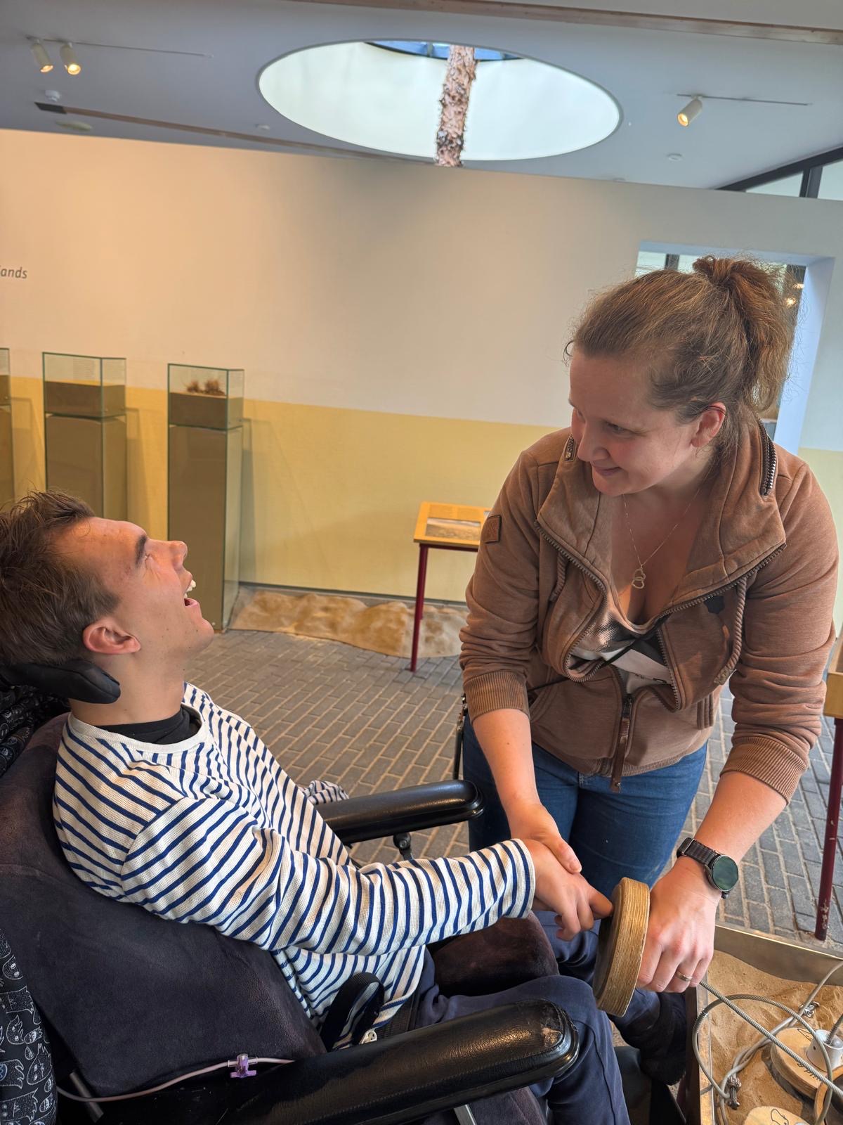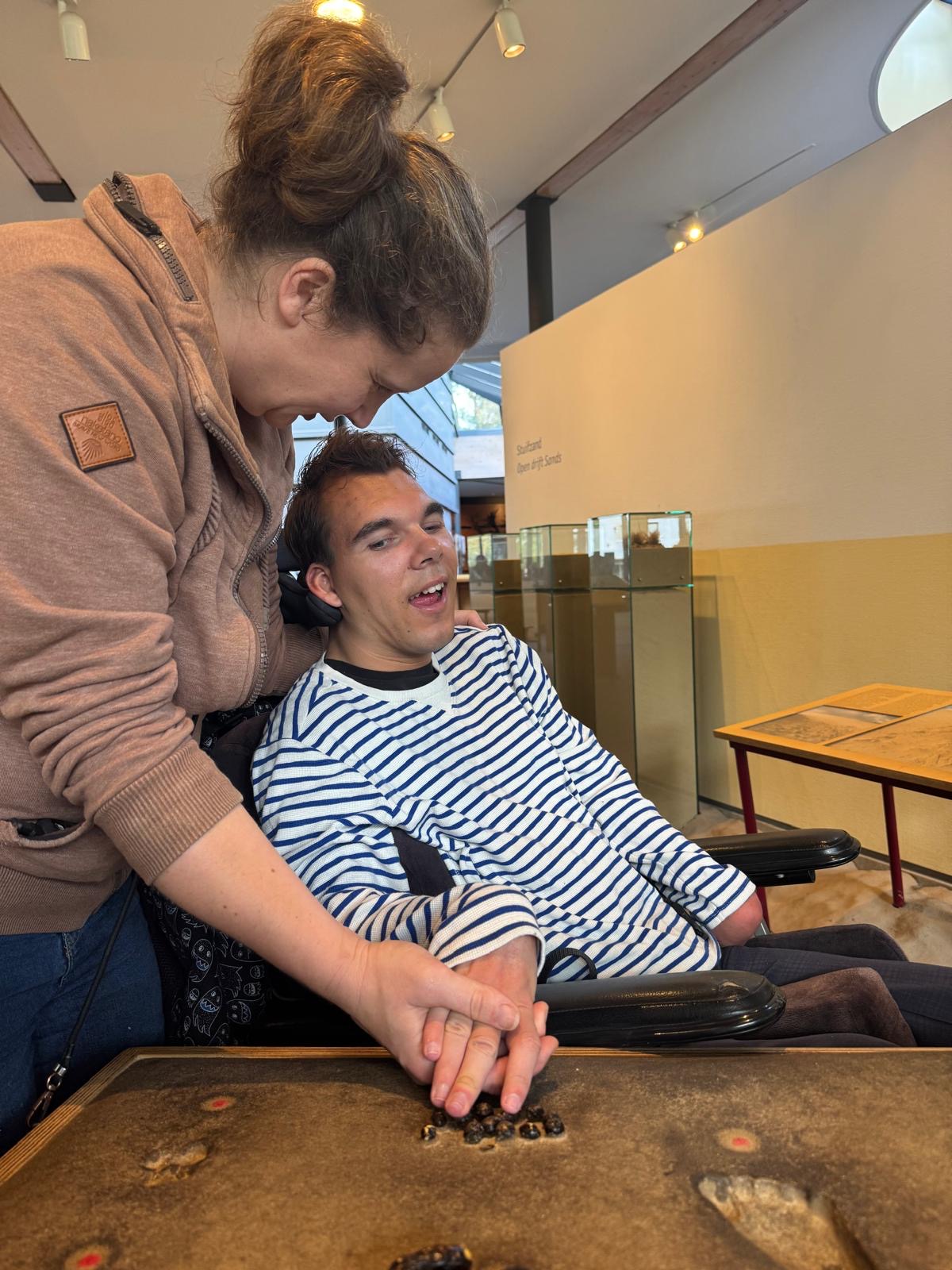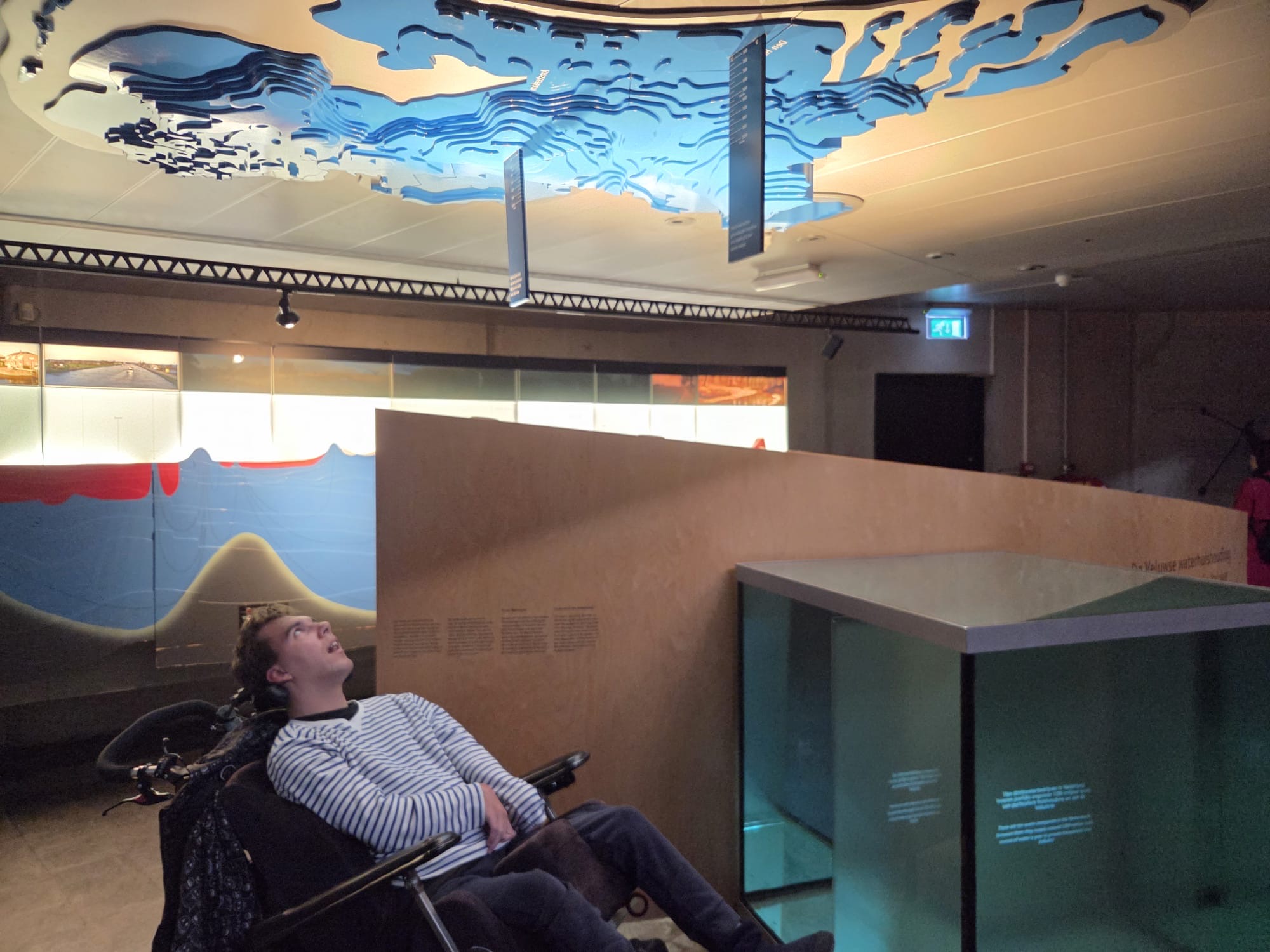 Daarna konden we in een bos met vogelgeluiden rondlopen, dat was natuurlijk fantastisch. Hierna vertrokken we naar beneden. Daar konden we in het binnenste van de aarde kijken. Mees kon het vanuit zijn rolstoel niet zien dus heb ik hem bovenop het kijk glas gelegd. Daar moest hij enorm om lachen en hij zat aandachtig naar beneden te kijken. Op het plafond konden we de deltawerken zien. Ook konden we verschillende zwerfkeien zien en voelen waarbij je de wind kon voelen waarmee ze glad gemaakt worden. Erg leerzaam allemaal.