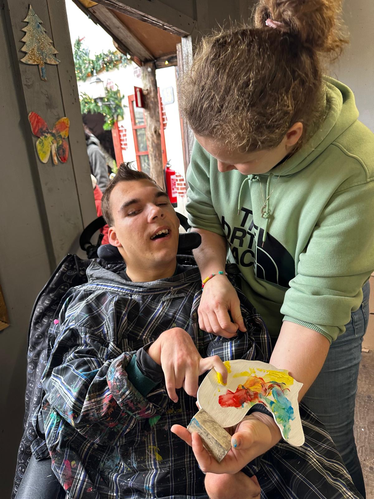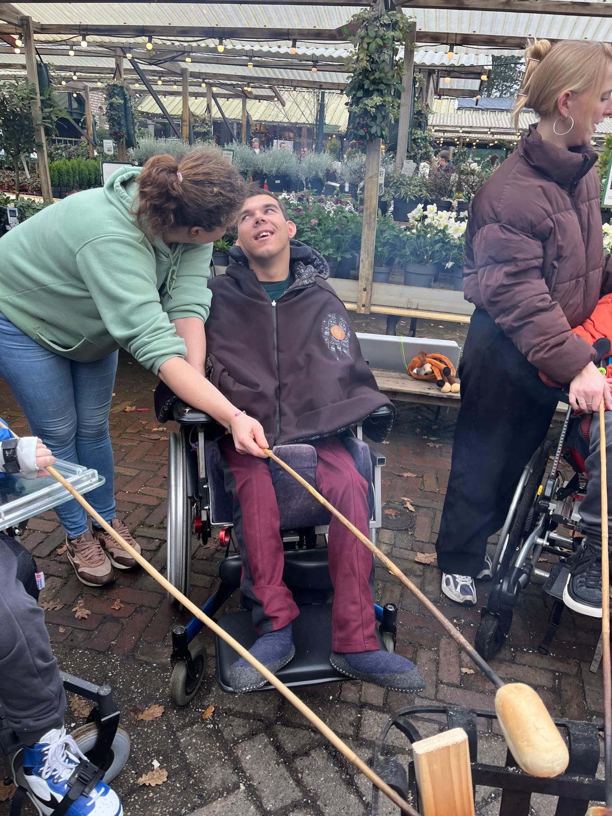 - de rolstoel even helemaal naar voren kiepen zodat zijn hoofd los komt van zijn hoofdsteun en hij zelf actief zijn hoofd recht moet houden. Dit hoeft dan een paar minuutjes een aantal keren per dag