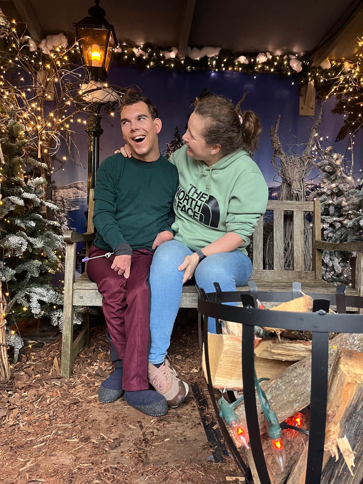 8 december 2025Tuincentrum ’t Vaarderhoogt in Soest en NeuroMovement les in Doorn – In de ochtend zijn we naar Vaarderhoogt geweest. We hebben de huisjes en dieren bekeken. Maar de kers op de taart was toch echt houthakker Henk. Die toverde weer een aantal vogelgeluiden te voorschijn. Ook herkende hij Mees weer. Leuk om de interactie tussen deze twee te zien.