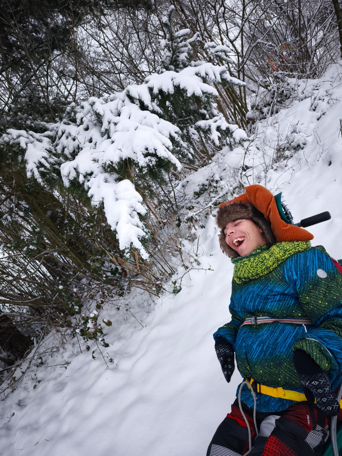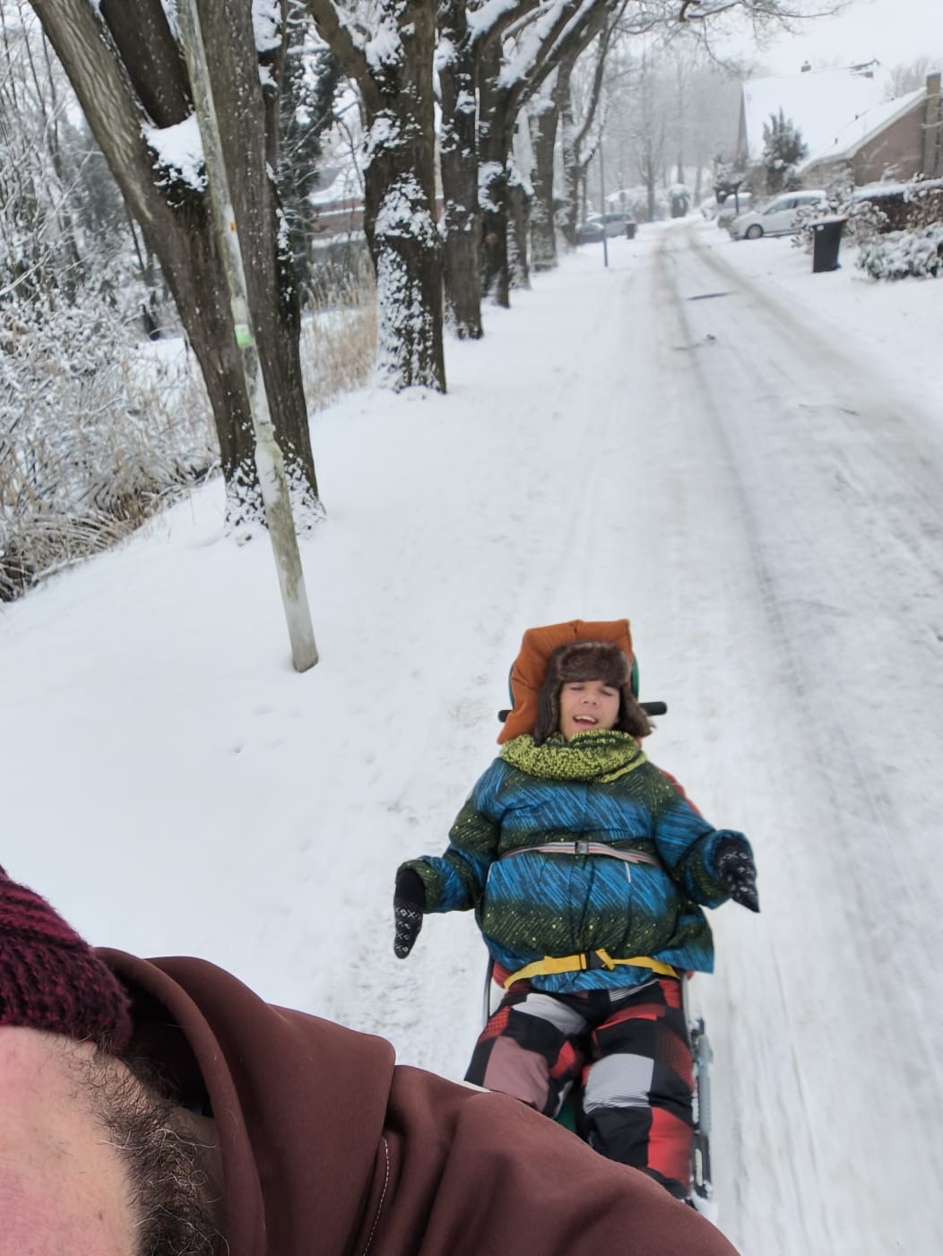 Heerlijk in de sneeuw, eerst rondje eiland toen nog even door de Glind alleen op sommige plekken was de sneeuw een beetje weg gereden. Al dat wit is toch wel heel fel voor ogen als je het aan Mees vraagt. Maar hij vond het wel leuk. We hebben veel gelachen vooral als het zwaar werd of als ik aan het glijden was.