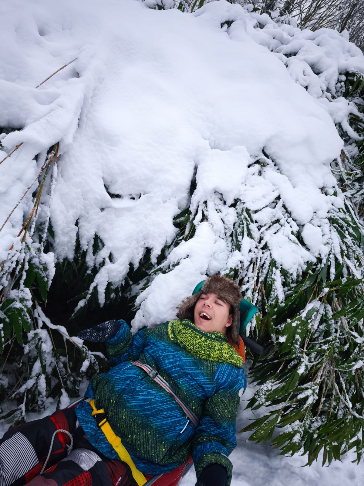 Na het ochtendritueel heeft Mees even lekker op het waterbed gelegen. Eerst met de familie von Trapp en daarna hebben we een paar hoofdstukken eilanden ruzie gelezen. Hierna zijn we fijn een stuk met de slee op pad gegaan.