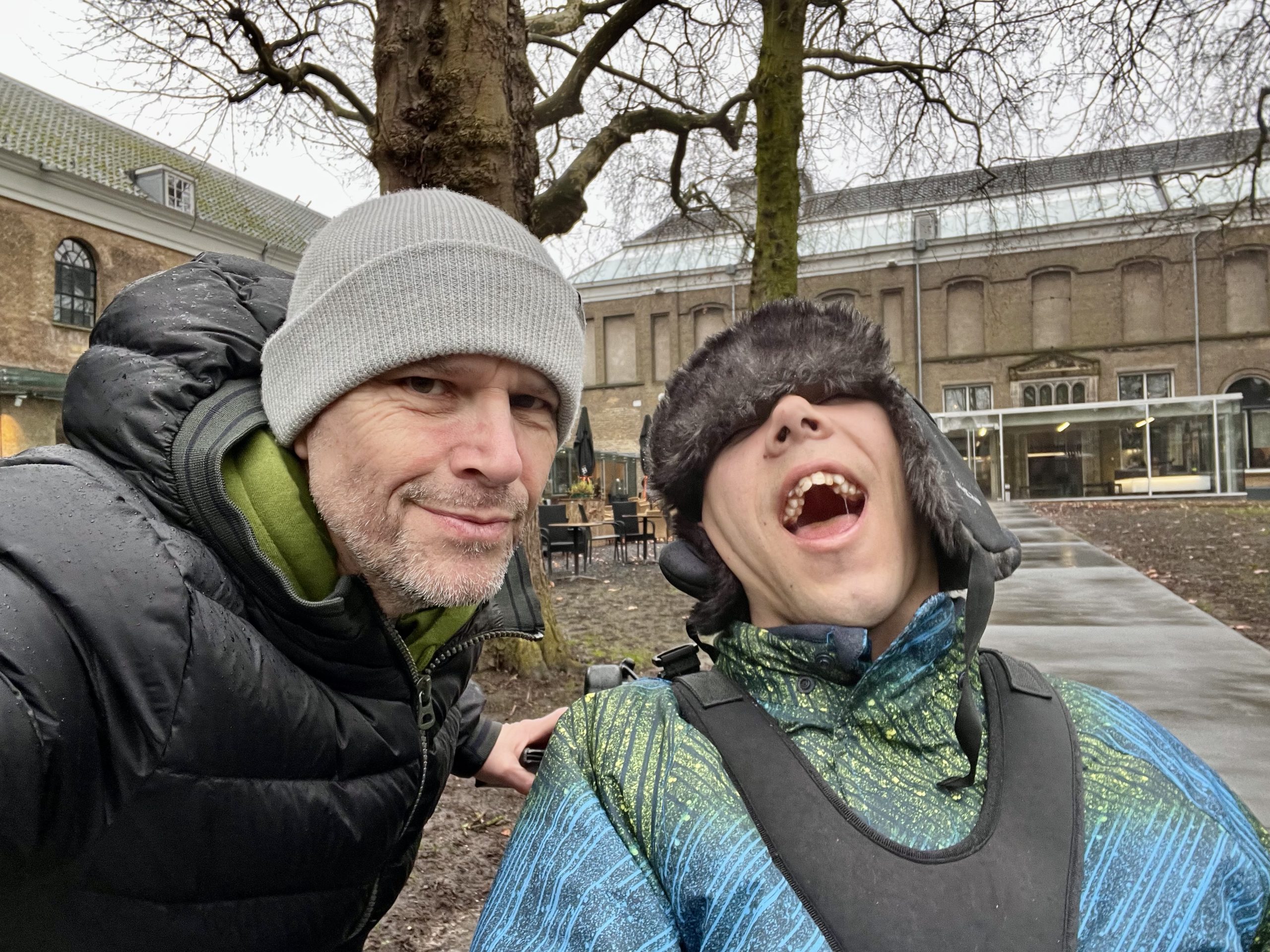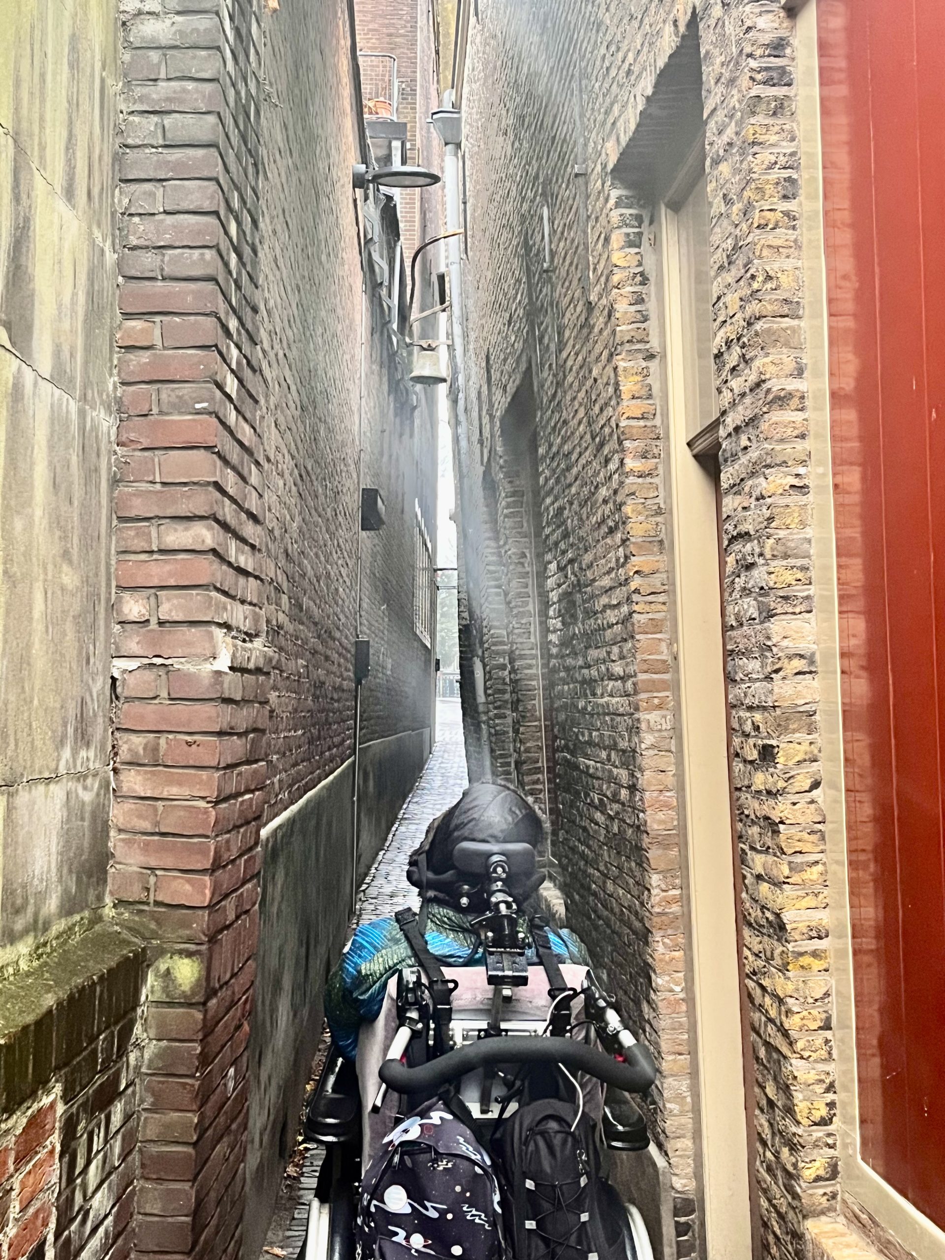 Na een dik uur zijn we de stad in gegaan. Qua temperatuur was het best zacht. We hadden veel lol samen, zelfs toen het flink ging miezeren. We werden er best nat van, maar gelukkig niet door onze kleding heen. We zijn door nauwe steegjes en straten langs oude havens gewandeld. Mees wilde nog even zijn eigen winkel laten zien. Na een paar uur en 10 km verder zijn we weer naar huis gereden.